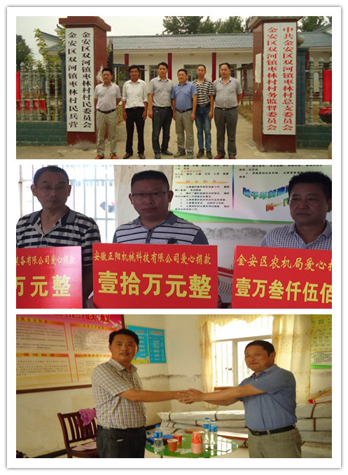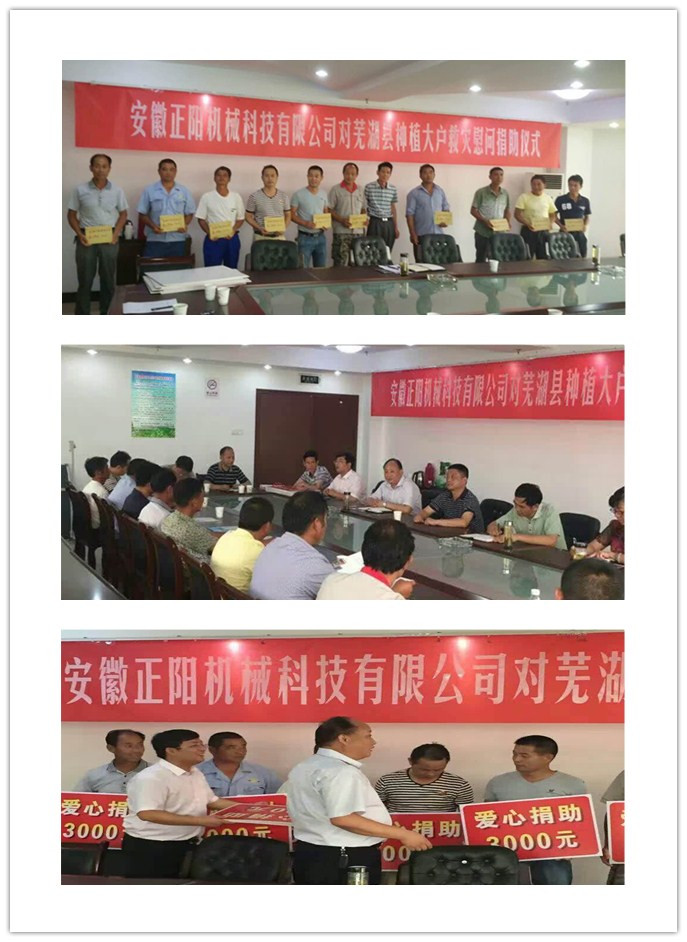 同時(shí)我公司針對(duì)今年長(zhǎng)江中下游、江淮區(qū)域發(fā)生的嚴(yán)重的洪澇災(zāi)害勇于擔(dān)當(dāng),注重快速發(fā)展自身的同時(shí)更高度重視企業(yè)社會(huì)責(zé)任,本著以回報(bào)社會(huì)為己任;企業(yè)利潤(rùn)來(lái)之于民、用之于民;義利兼顧的宗旨,安徽正陽(yáng)機(jī)械科技有限公司總經(jīng)理張為法于2016713日下午前往“正陽(yáng)”糧食烘干機(jī)主銷區(qū)域安徽蕪湖、六安、湖北孝感等受災(zāi)嚴(yán)重地區(qū)捐贈(zèng)現(xiàn)金數(shù)十萬(wàn)元,幫助災(zāi)區(qū)人民萬(wàn)眾一心共抗洪災(zāi),盡快恢復(fù)生產(chǎn),讓受災(zāi)群眾真實(shí)感受到黨和政府的溫暖、民營(yíng)企業(yè)家的責(zé)任,公司以正能量品牌的形象和風(fēng)范履行了自身應(yīng)盡的社會(huì)責(zé)任。